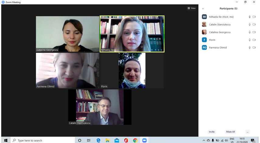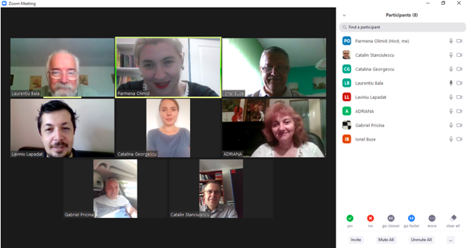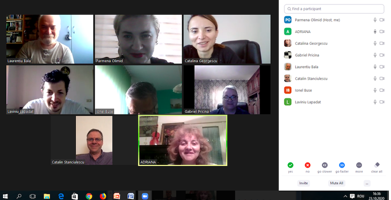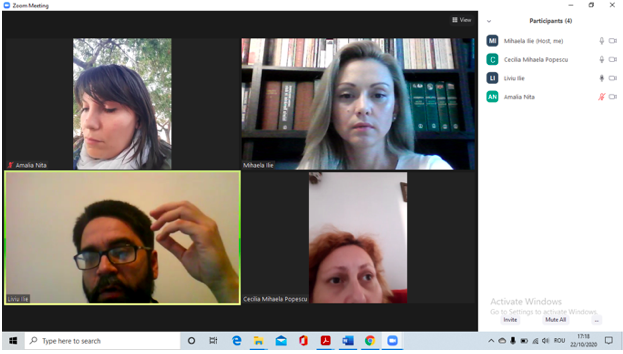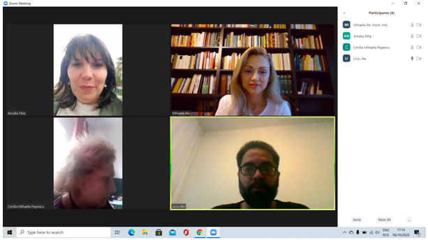 În data de 28 octombrie 2020, la ora 16, a avut loc ședința echipei de implementare a proiectului, în mediul online, folosind platforma ZOOM. Mai jos sunt prezentate câteva instantanee: