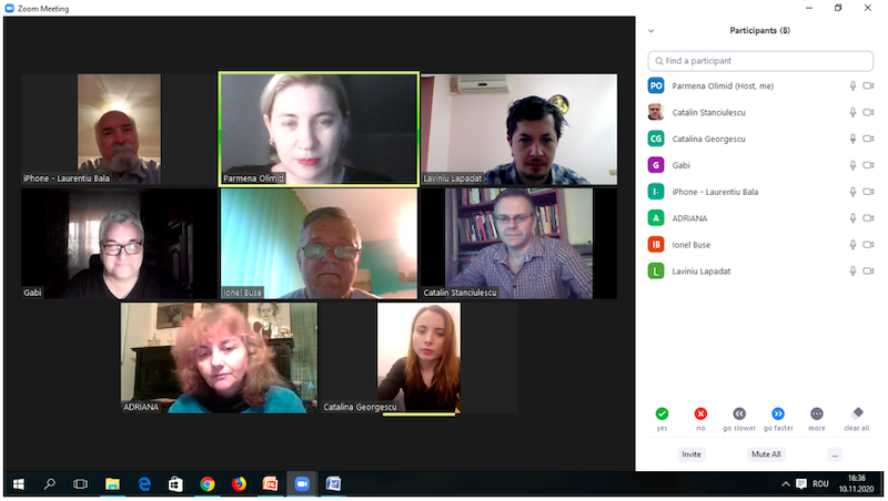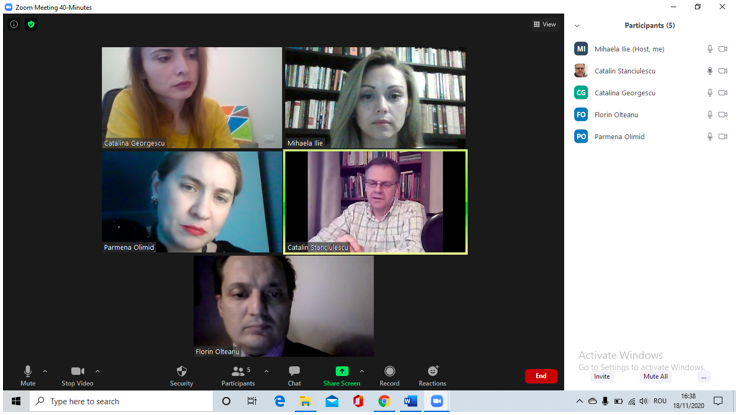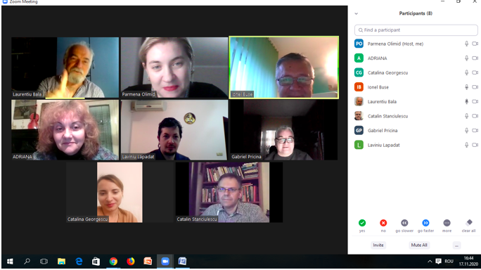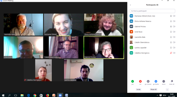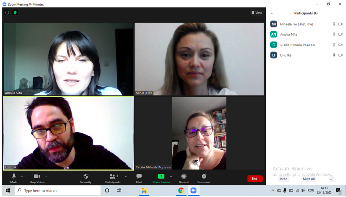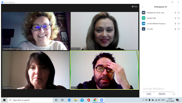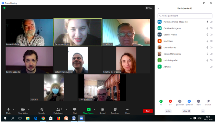 În data de 25 noiembrie 2020, la ora 16, a avut loc ședința echipei de implementare a proiectului, în mediul online, folosind platforma ZOOM. Mai jos sunt prezentate câteva instantanee: