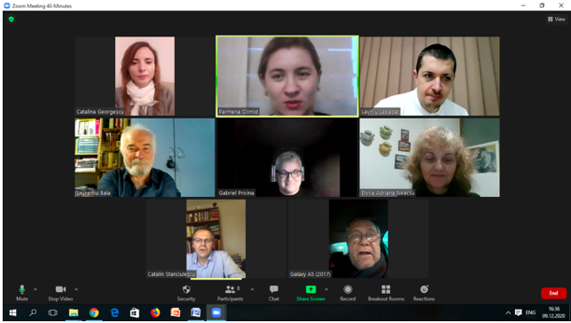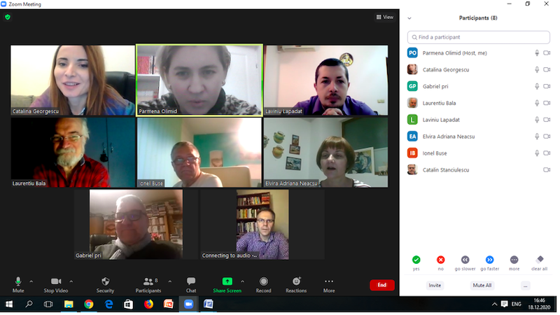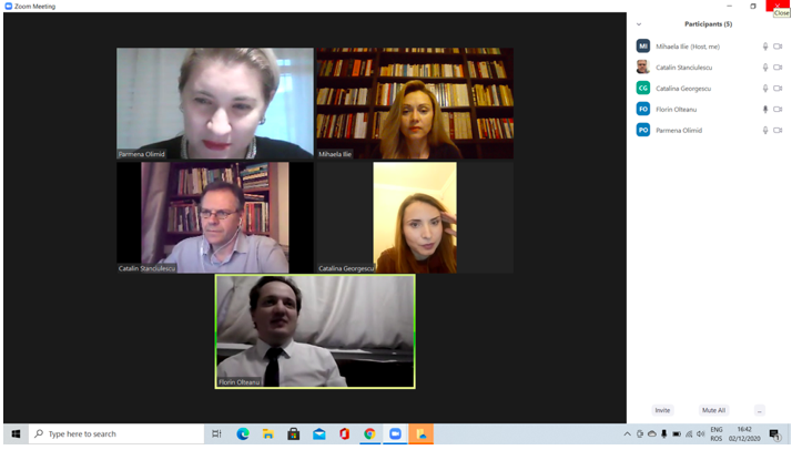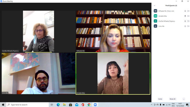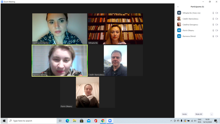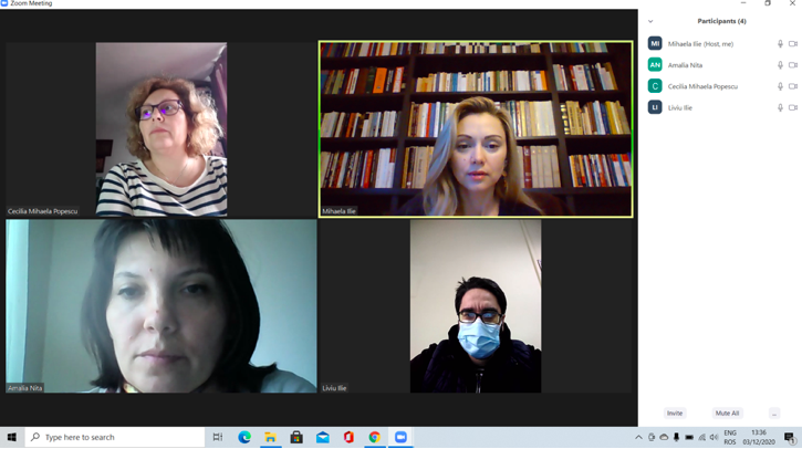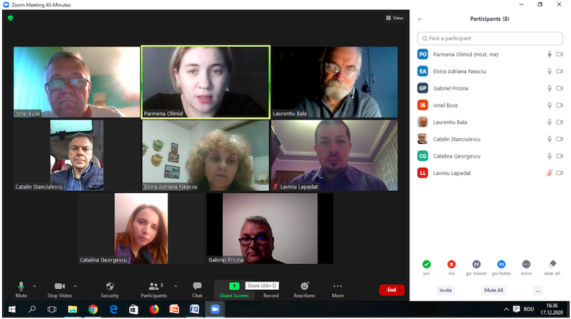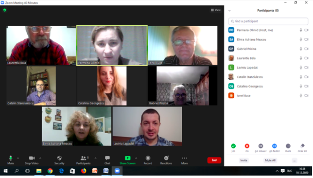 În data de 16 decembrie 2020, la ora 16, a avut loc ședința echipei de implementare a proiectului, în mediul online, folosind platforma ZOOM. Mai jos sunt prezentate câteva instantanee: