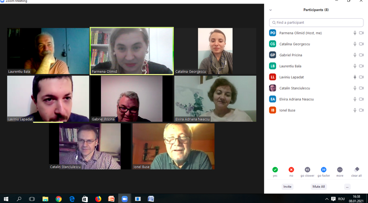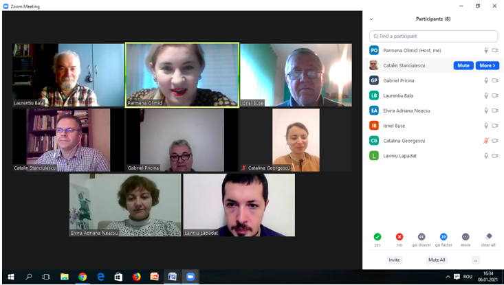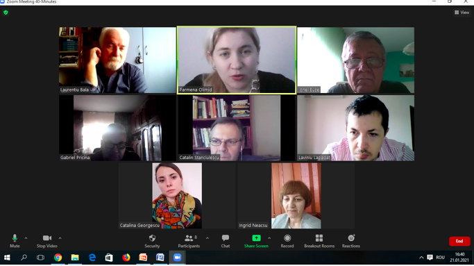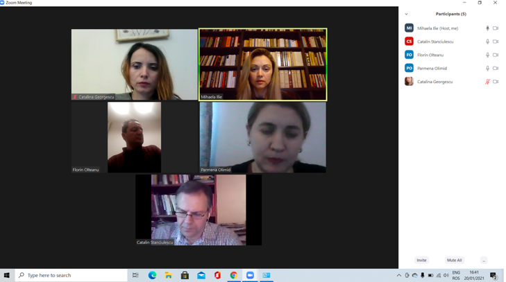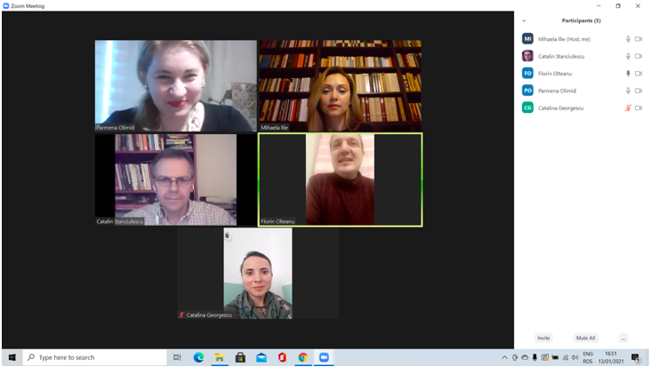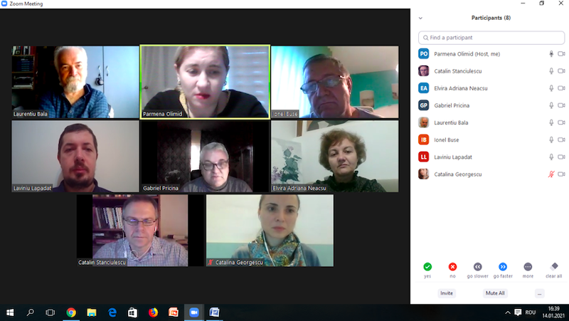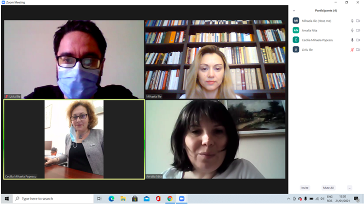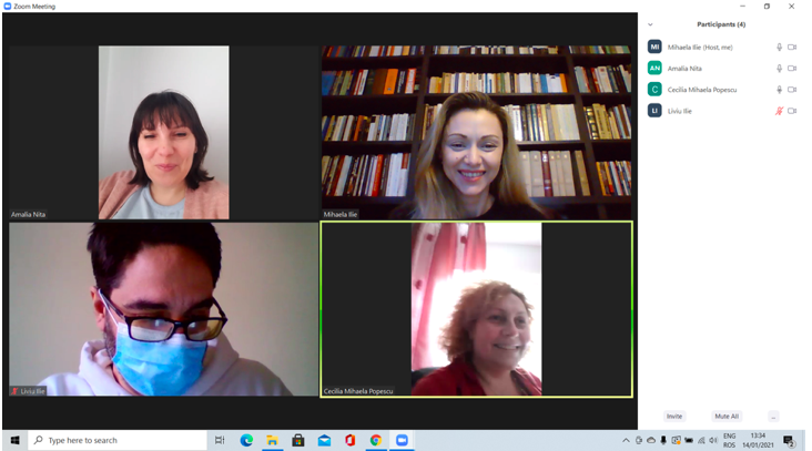 În data de 27 ianuarie 2021, la ora 15, a avut loc ședința echipei de implementare a proiectului, în mediul online, folosind platforma ZOOM. Mai jos sunt prezentate câteva instantanee: