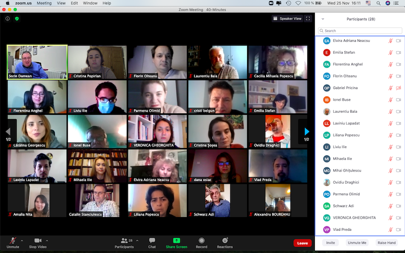 În data de 25 noiembrie 2020, la ora 16, a avut loc ședința echipei de implementare a proiectului, în mediul online, folosind platforma ZOOM. Mai jos sunt prezentate câteva instantanee: