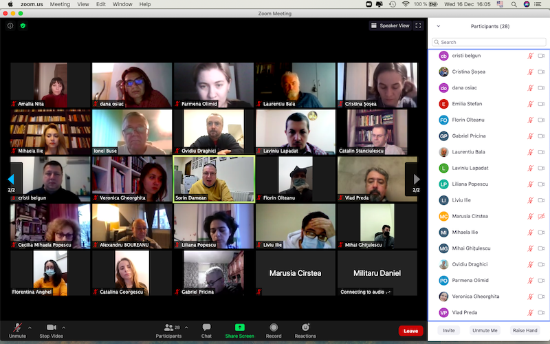 În data de 16 decembrie 2020, la ora 16, a avut loc ședința echipei de implementare a proiectului, în mediul online, folosind platforma ZOOM. Mai jos sunt prezentate câteva instantanee:
