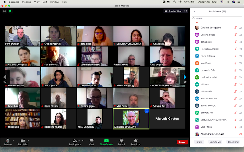 În data de 27 ianuarie 2021, la ora 15, a avut loc ședința echipei de implementare a proiectului, în mediul online, folosind platforma ZOOM. Mai jos sunt prezentate câteva instantanee: