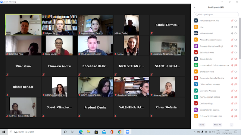 Cele două întâlniri din data de 15 aprilie vizând consultanța antreprenorială s-au desfășurat online pe platforma Zoom cu experții consultanți dl. Cristian Belgun și dl. Daniel Militaru și se încadrează în Activitatea 7.1 Dezvoltarea competențelor antreprenoriale ale studenților din grupul țintă a proiectului. La prima întâlnire, cea de la ora 12:00 au participat 40 de studenți și 3 experți, iar la cea de-a doua, cea […]