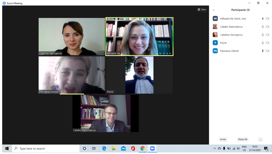 În data de 21 octombrie 2020, a avut loc întâlnirea de lucru lucru Expert 5 grup țintă studenți și Mentori (8, 9, 10, 11), în mediul online, folosind platforma ZOOM. Mai jos sunt prezentate câteva instantanee: