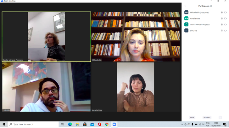 În data de 15 decembrie 2020, a avut loc întâlnirea de lucru Experți grup țintă studenți, în mediul online, folosind platforma ZOOM. Mai jos sunt prezentate câteva instantanee: