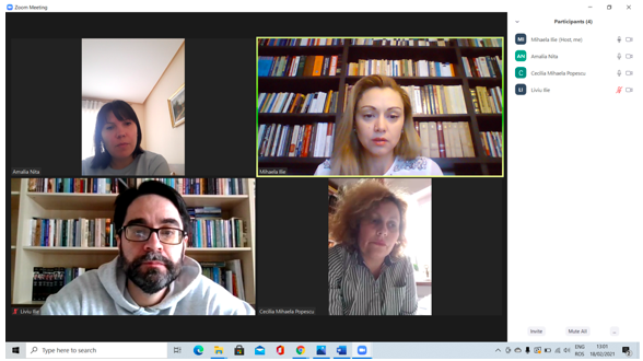 În data de 18 februarie 2021, a avut loc întâlnirea de lucru Experți grup țintă studenți, în mediul online, folosind platforma ZOOM. Mai jos sunt prezentate câteva instantanee: Share: Conf. univ. dr. Cristina POPÎRLAN View all posts by Conf. univ. dr. Cristina POPÎRLAN